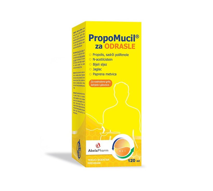 Aktivni sastav: Propolis, med, N-acetilcistein, bijeli sljez, jaglac i paprena metvica