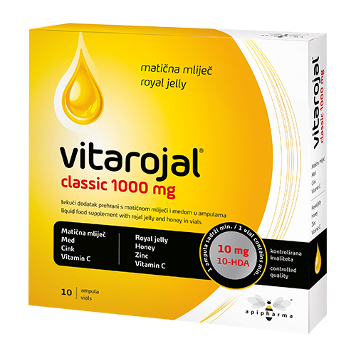 Vitarojal classic 1000 mg sadrži matičnu mliječ koja je prirodni biostimulator organizma. Svaka ampula sadrži 1000 mg matične mliječi. Matična mliječ (gelee royale) je najvrijedniji i najcjenjeniji proizvod pčela. Predstavlja izlučevinu posebnih žlijezda mladih pčela radilica kojom se hrani matica i mlade ličinke do tri dana starosti. Matična mliječ je neposredno odgovorna za zadivljujuću plodnost, vitalnost i dugovječnost matice. Svaka ampula sadrži vitamin C i mineral cink koji doprinose funkcioniranju imunološkog sustava. Vitarojal classic 1000 mg ugodnog je okusa na naranču.