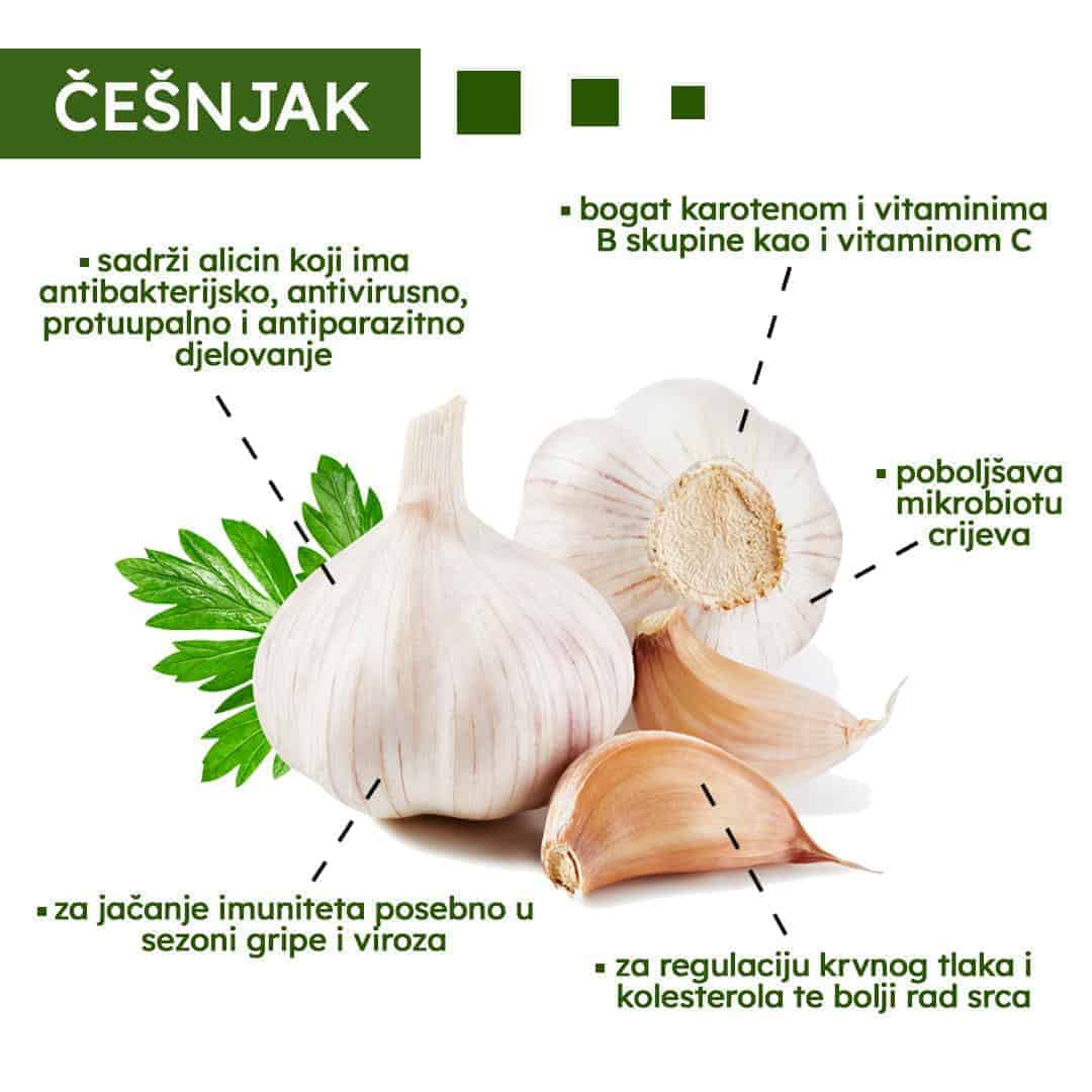 Češnjak, biljka prepoznatljivog mirisa koja je jedan od najčešćih sastojaka u kulinarstvu, posjeduje iznimna ljekovita svojstva te djeluje na očuvanje zdravlja cijelog organizma.