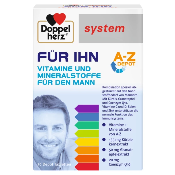 Doppelherz® system Za njega A – Z DEPO sadrži vitamine, minerale, elemente u tragovima te ekstrakt sjemenki bundeve, ekstrakt nara i koenzim Q10 stoga je svojim sastavom prilagođen prehrambenim potrebama muškaraca.