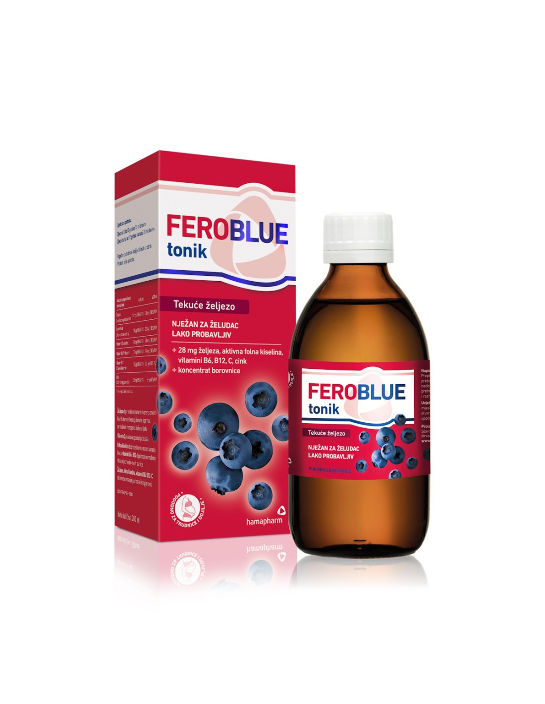 FeroBlue tonik sadrži 28 mg željeza u obliku keliranog željezovog bisglicinata. Doprinosi smanjenju umora i iscrpljenosti te lakše nadoknade željeza za odrasle i djecu.