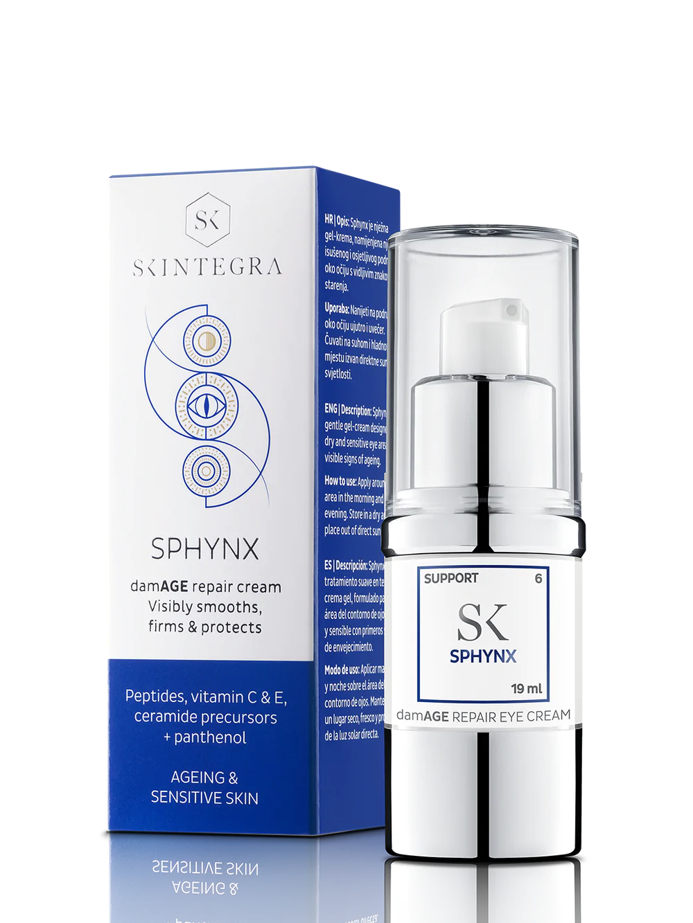 Sphynx je tretmanska gel-krema za njegu isušenog i osjetljivog područja oko očiju bogata vitaminima, antioksidansima, umirujućim i reparativnim komponentama. Namijenjena je preventivnoj i korektivnoj njezi svih tipova kože s kojom se može započeti već u srednjim dvadesetima.