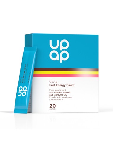 UpAp Fast Energy Direct: Izvor esencijalnih 13 vitamina i 10 minerala s dodatkom koenzima Q10 za postizanje brze energije u pokretu i za smanjenje umora i iscrpljenosti. Uzima se bez vode i zato ga možemo uzeti bilo gdje, a rastapanje u ustima omogućuje brzu apsorpciju.